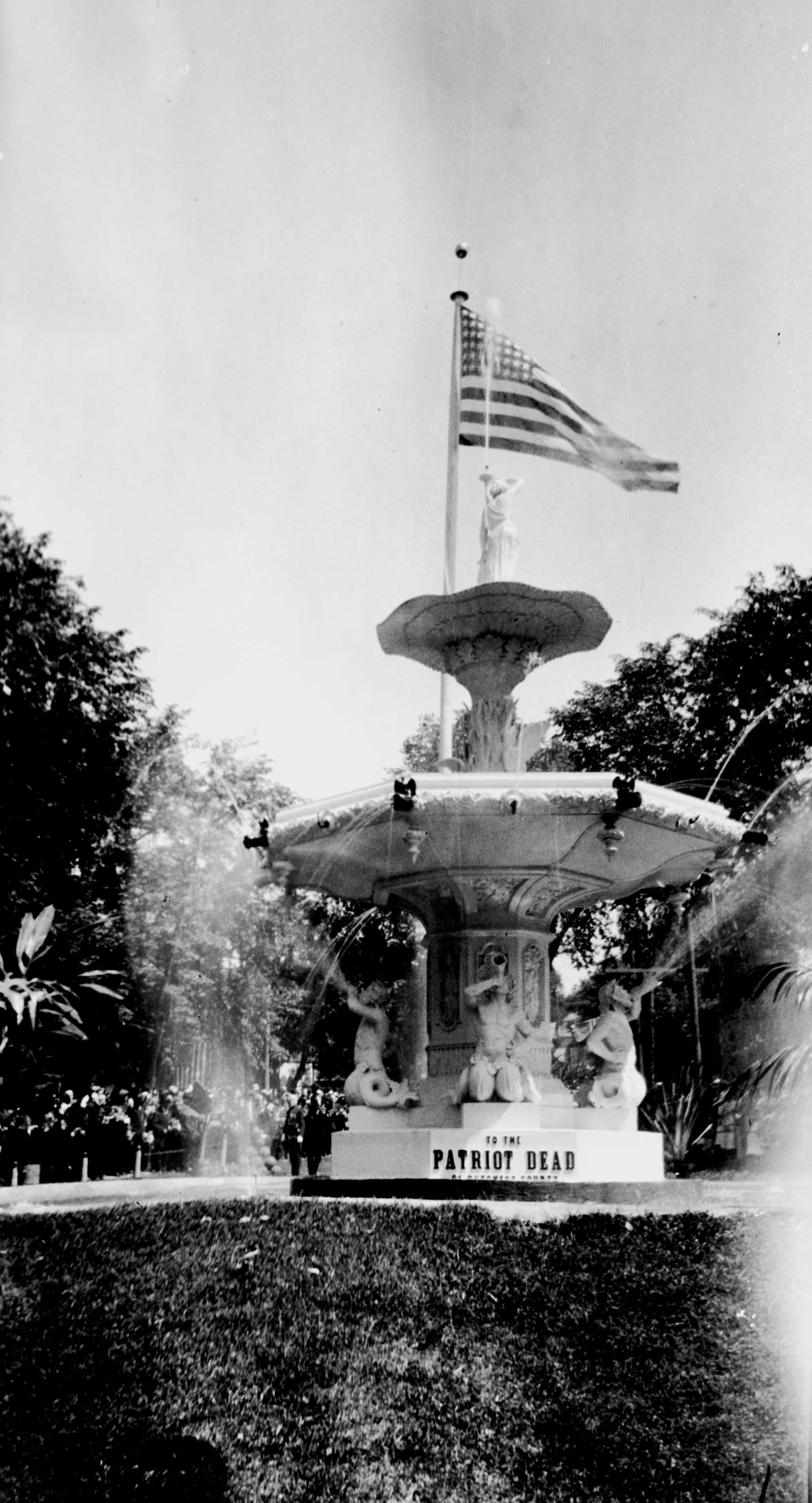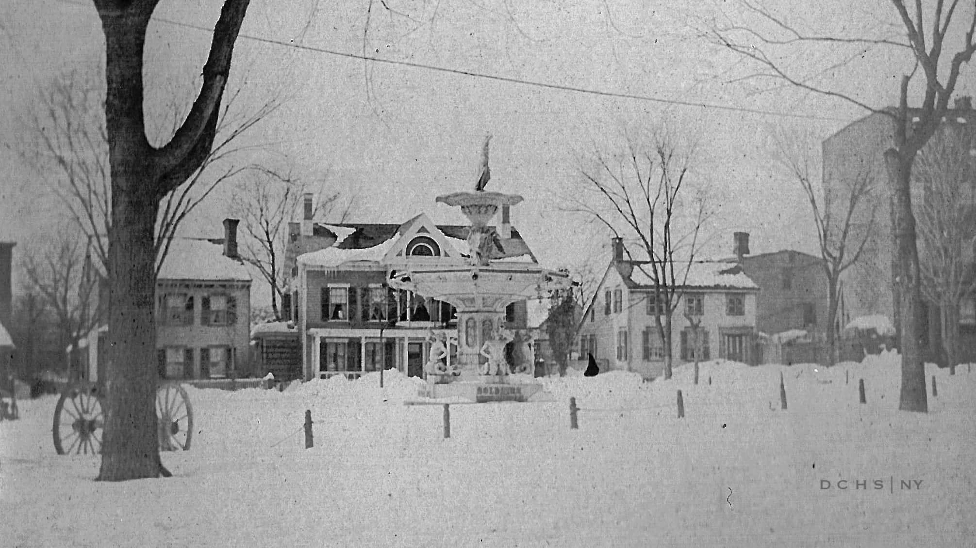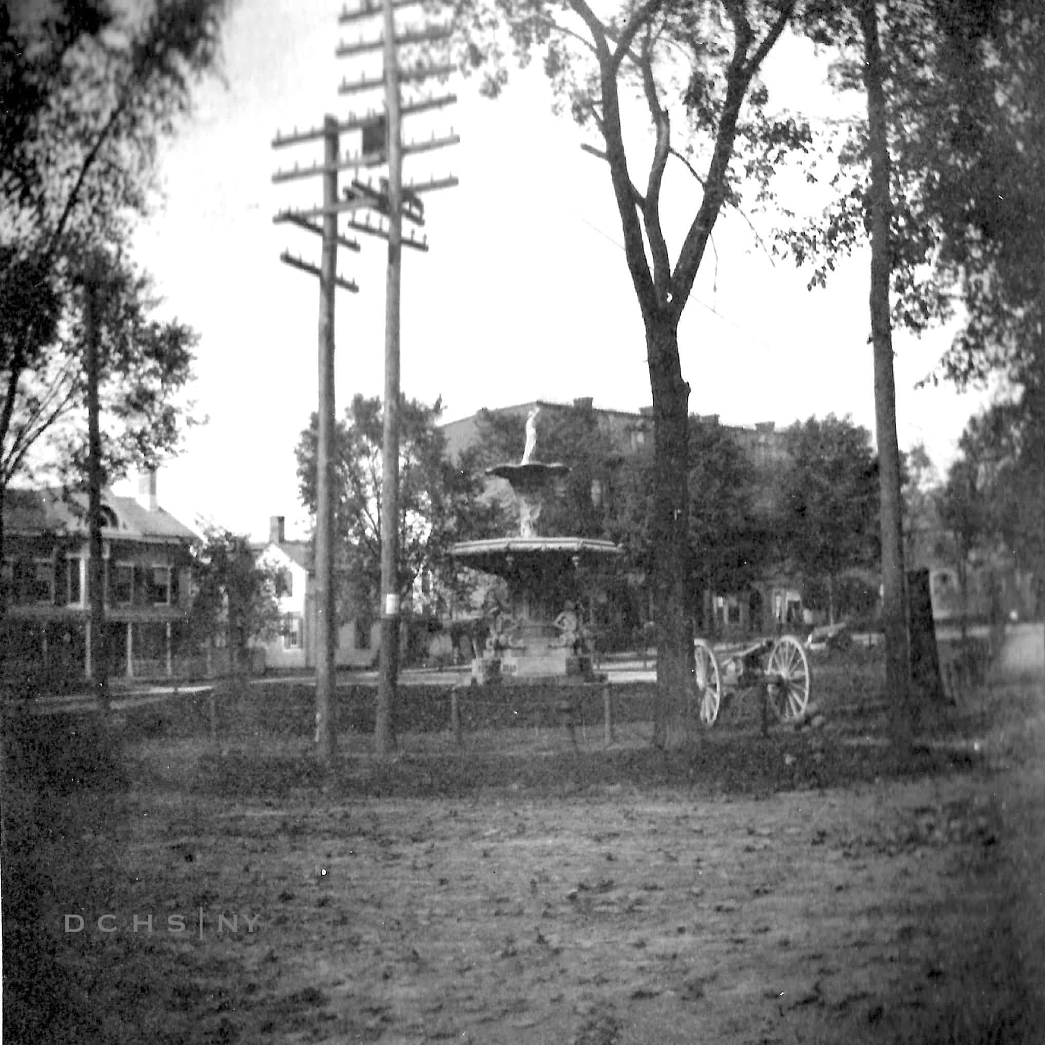 Vassar Professors Laura J. Wylie (above at left) and Gertrude Buck (above at right) hosted many gatherings in favor of women’s suffrage and other social justice and educational issues at their home at the fountain. With their beloved dog. Wylie and Buck photos by Margaret DeMott Brown, DCHS Collections. Contemporary photo by Bill Jeffway, 2019.